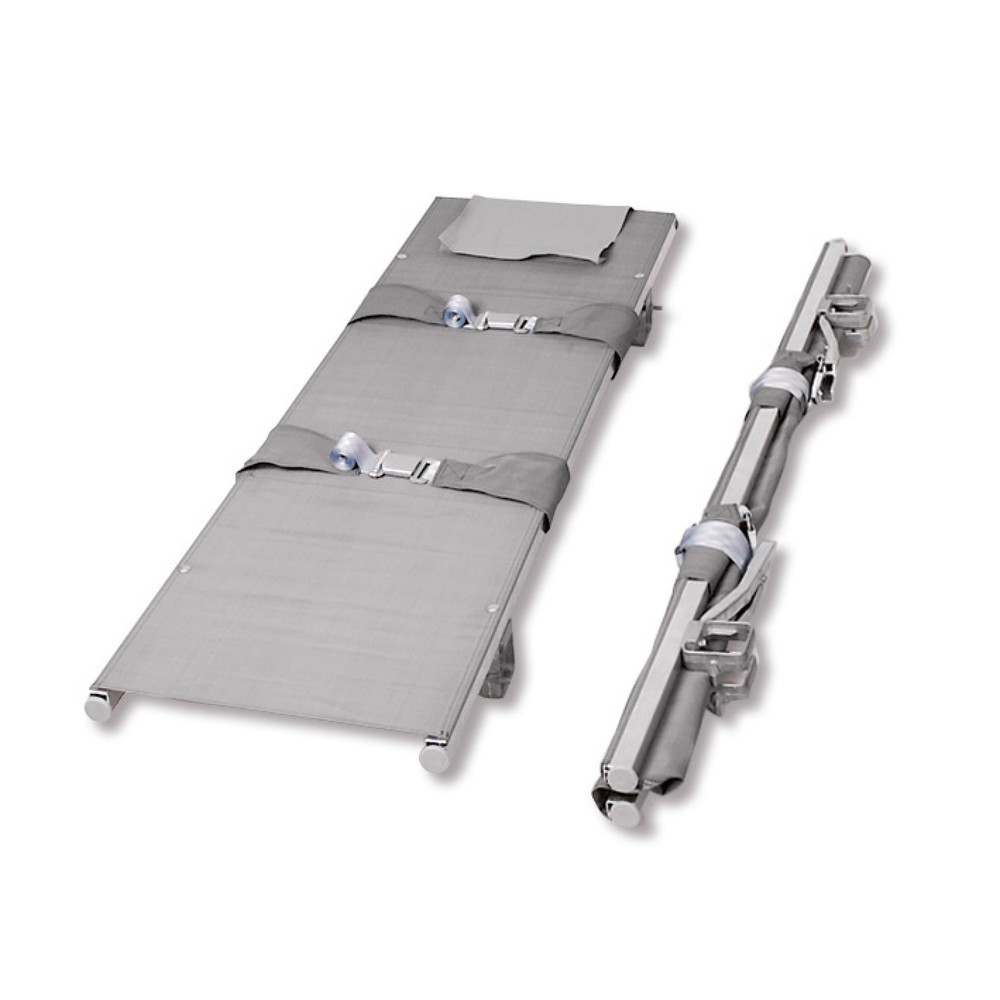 Mit der Krankentrage gemäß DIN 13024 ist es möglich, Verletzte vom Unfallort zum Rettungswagen oder der Notfallstation schnell und sicher zu transportieren. Die Trage ist in der Breite klappbar faltbar, wodurch es möglich ist diese platzsparend zu verstauen, sodass sie in jedem Rettungsfahrzeug problemlos gelagert werden kann und jederzeit einsetzbereit ist. Die ausziehbaren Griffe erleichtern das Tragen. Brust- und Fußgurte sind mit einem Schnellverschluss versehen, welche den Transport unterstützen und einen sicheren Halt der verletzten Person auf der Trage gewährleisten. Mit den verriegelbaren Quergelenken wird die Stabilität erhöht, wodurch es möglich ist, Personen bis 150 kg zu transportieren. Die Trage in der Farbe Grau besteht aus Aluminium. Zusätzlich ist sie kunststoffbeschichtet und mit einem Bezug aus Chemiefasergewebe ausgestattet. Das Gewebe ist abwaschbar, wasserdicht und desinfizierbar, wodurch die Hygiene erhalten werden kann und keine zusätzliche Abdeckung notwendig ist. Außerdem ist das Gewebe widerstandsfähig und hoch reißfest, was die Stabilität nochmals unterstützt. Vier Gleitfüßen an der Unterseite ermöglichen einen stabilen Stand, wenn die Trage abgelegt werden muss. Ausgeklappt hat die Trage folgende Maße: 230,2 x 55,6 x 13,7 cm.